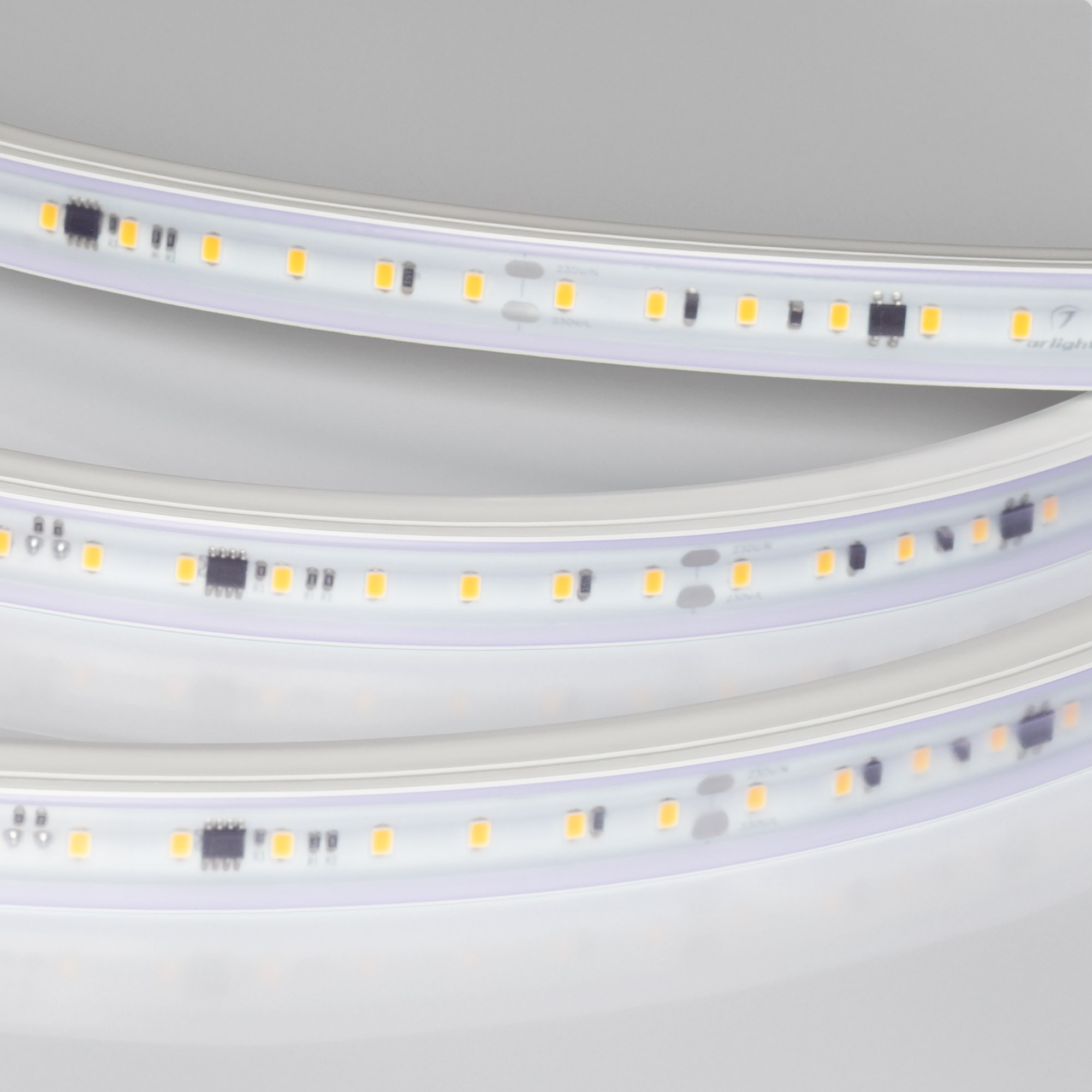 Светодиодная герметичная лента ARL серии A84 со степенью защиты IP65, защитная оболочка из ПВХ устойчива к УФ излучению. Высокий индекс цветопередачи CRI>85 обеспечивает точное восприятие цветовых оттенков. Лента подключается непосредственно к сети переменного тока 230 В и не требует использования источников питания. Наличие интегральных стабилизаторов тока позволяет подключать ленту длиной до 50 м, обеспечивая при этом равномерную яркость свечения по всей длине ленты. При подключении нескольких лент необходимо подавать питание на каждые 50 м отдельным кабелем, последовательное подключение лент более 50 м запрещается. Лента применяется для декоративной подсветки помещений, потолочных ниш, создания контуров рекламных объектов внутри помещений. Ленты обладают низким коэффициентом пульсаций FlickerFree <2%. Для расчета потребляемой мощности необходимо учитывать коэффициент мощности - PF>0.75. На лентах установлены микросхемы с функцией снижения тока для защиты ленты от перегрева, обеспечивающие надежную работу в различных условиях. Диммирование в диапазоне 30%-90% осуществляется TRIAC диммерами с установкой минимального уровня яркости, при диммировании коэффициент пульсаций увеличивается. Крепление с помощью скоб, аксессуары для монтажа и подключения поставляются отдельно. Поставка под заказ от 100 м.