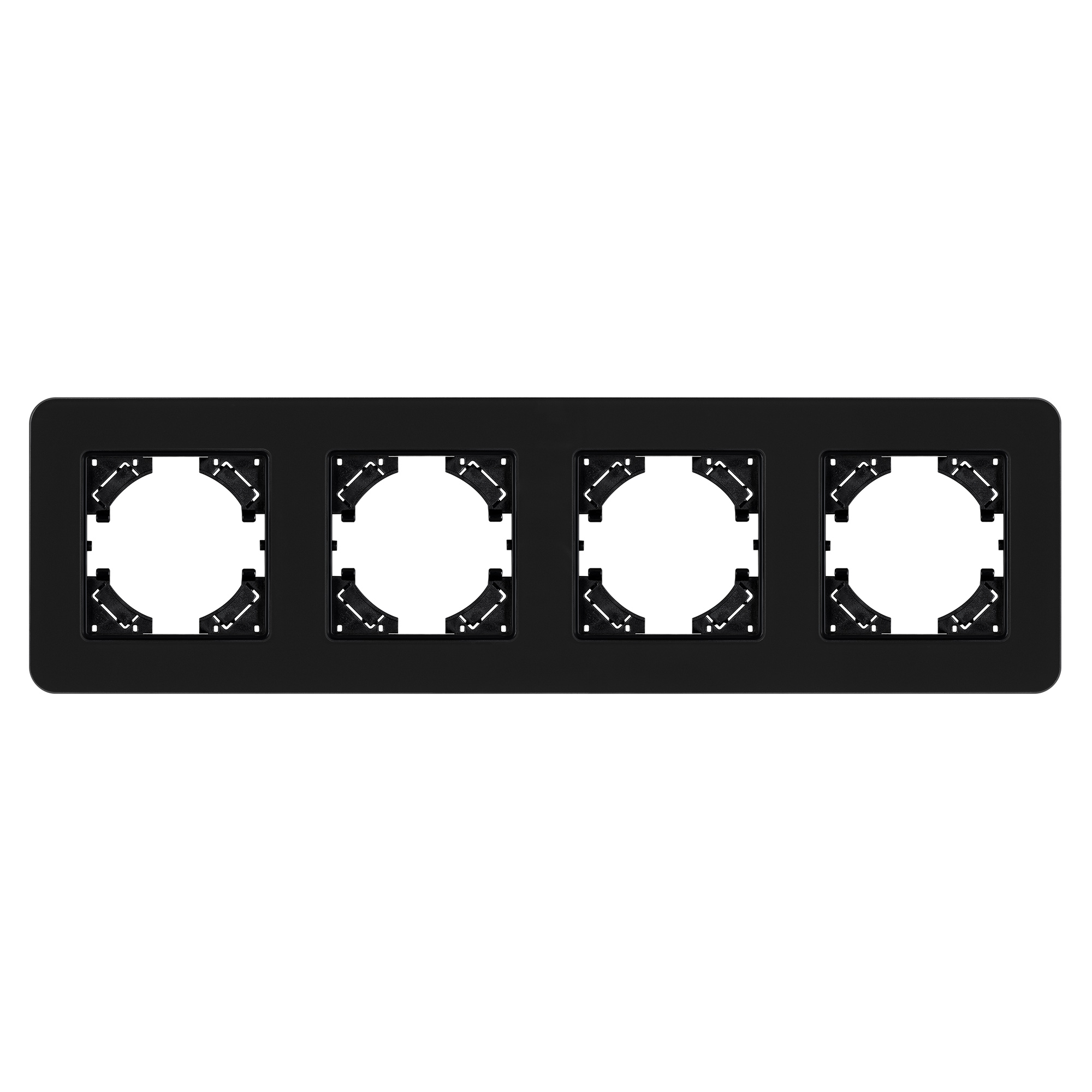 Рамка стеклянная на 4 поста, под встраиваемый механизм. Цвет - черный с Soft-Touch покрытием. Среднего уровня герметичности IP20. Ориентация монтажа - горизонтальная (основным ориентиром служат посадочные выступы для накладки механизма).