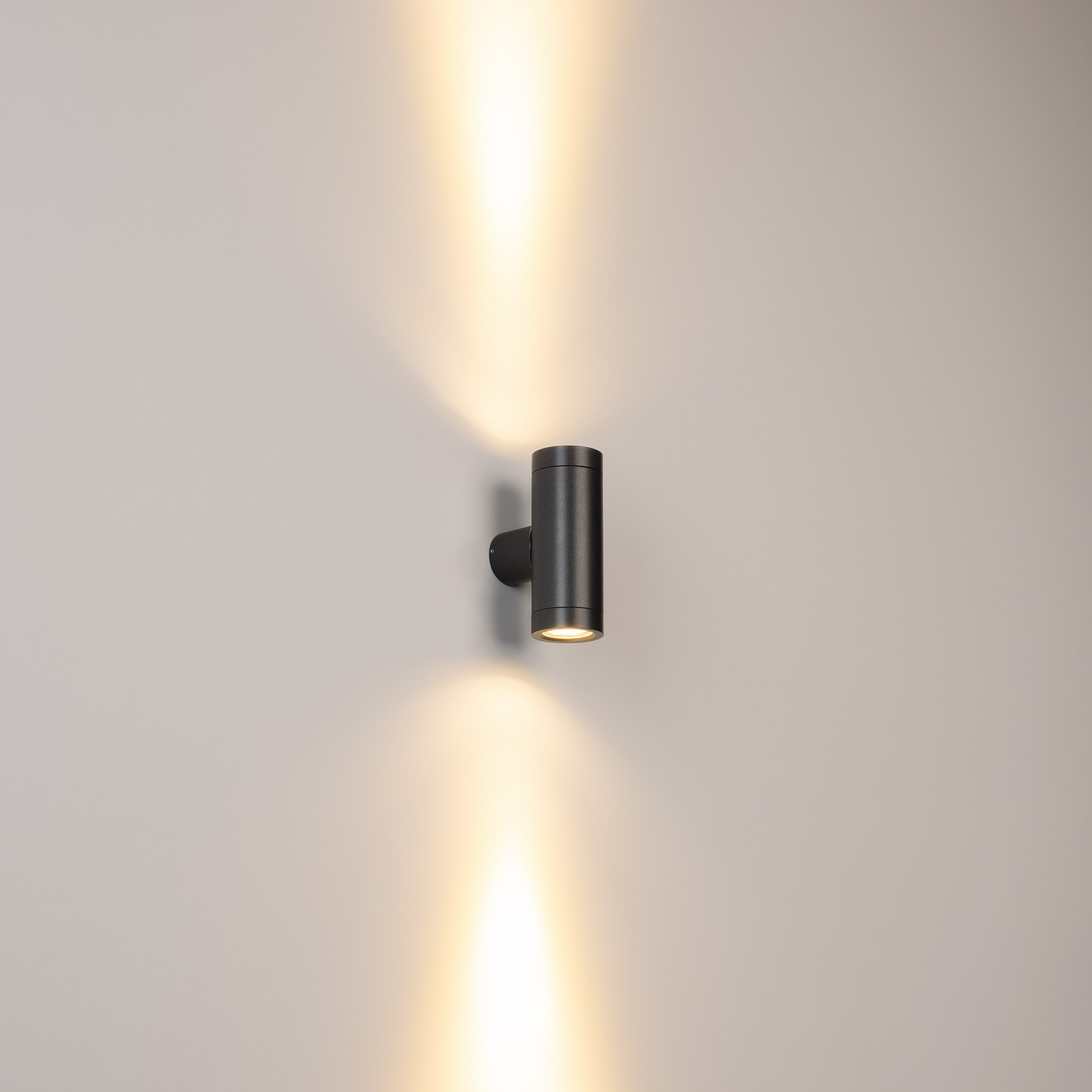 Накладной настенный светильник серии LGD-RAY-WALL-TWIN с двусторонним свечением вверх-вниз теплого белого цвета (3000 К) для создания декоративных световых эффектов на фасадах зданий. За счет узкого угла излучения 24° с обеих сторон и общего светового потока 800 лм светильник идеально подойдет для подсветки стен и колонн. Мощность модели диаметром 46 мм составляет 7,5 Вт. Алюминиевый корпус серого цвета и цилиндрической формы покрыт защитным анодным слоем и имеет высокую степень пылевлагозащиты (IP65), что позволяет эксплуатировать светильник непосредственно на улице. Подключение светильника осуществляется напрямую к сети 230 В с помощью встроенного драйвера.