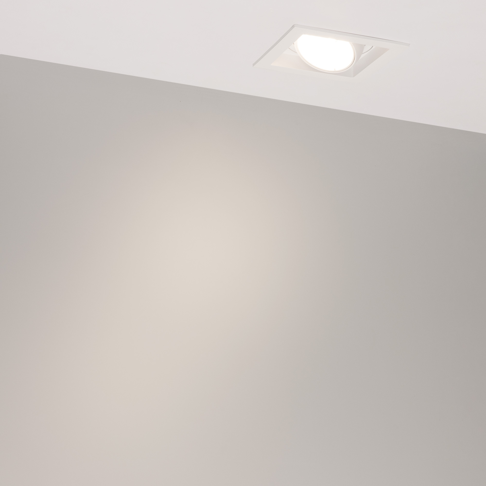 Встраиваемый карданный светильник. Мощность 20 Вт, св. поток 2132 лм, 107 лм/Вт, дневной 4000 K, CRI>92, угол 40°, напряжение питания 230 В. Белый корпус из алюминия, белая вставка, степень защиты IP20. Размер: длина 117 мм, ширина 117 мм, высота 105 мм. Монтаж встраиваемый, установочное отверстие: длина 95 мм, ширина 95 мм. Драйвер 24-42 В, 500 мА, пульсация <2%.
